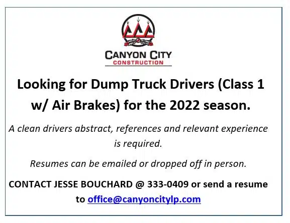 Canyon City Construction is looking for Dump Truck Drivers for the 2022 season. If you would like to apply for this position, please call Jesse Bouchard at 867-333-0409, or send your resume to office@canyoncitylp.com Share this post Share on FacebookShare on Facebook Share on XShare on X Share on LinkedInShare on LinkedIn