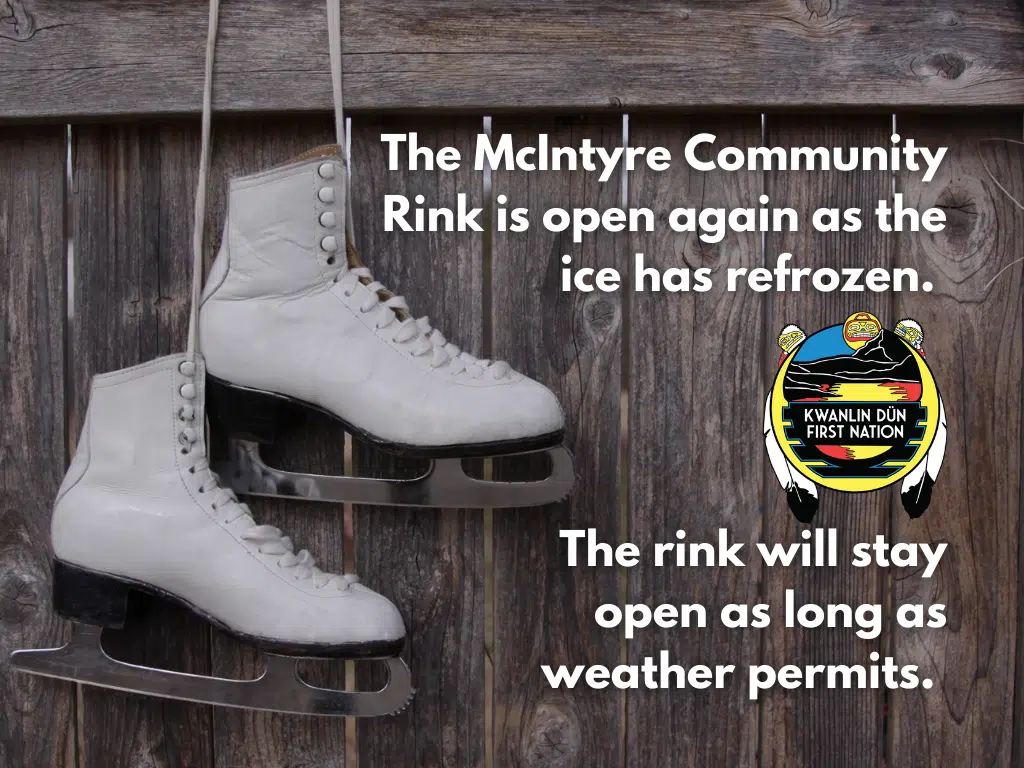 Hey KDFN! The McIntyre Community Rink is open again as the ice has refrozen. The rink will stay open as long as weather permits. Shä̀w níthän, másin cho, gunałchÎsh, and thank you for your understanding. Share this post Share on FacebookShare on Facebook Share on XShare on X Share on LinkedInShare on LinkedIn