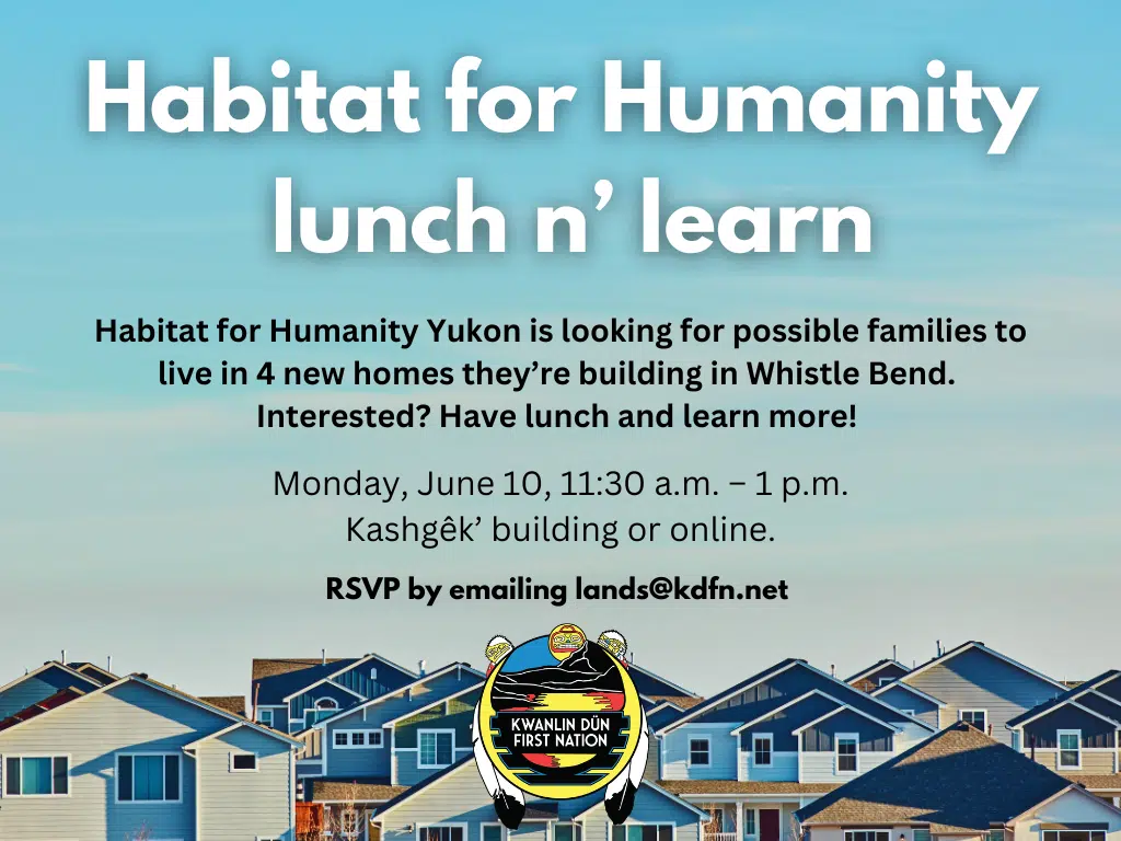 Habitat for Humanity Yukon is looking for possible families to live in 4 new homes they’re building in Whistle Bend. Interested? Have lunch and learn more! This lunch n’ learn will take place in the Bear’s Den at the Kashgêk’ building, 35 McIntyre Drive. If you would like to attend, please RSVP by emailing lands@kdfn.net. You can also attend online. Email us for more info.