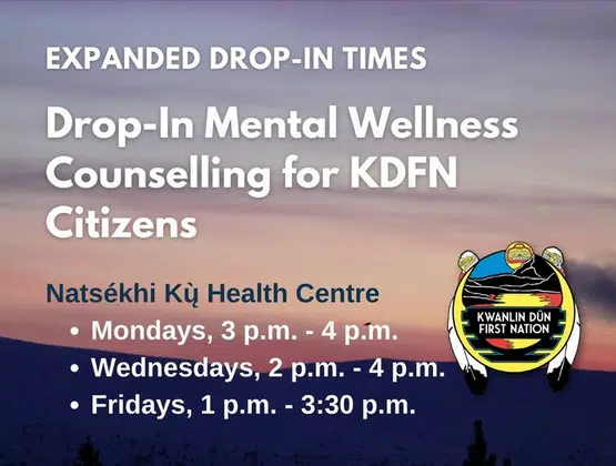 KDFN has expanded it’s Drop-In Mental Wellness Counselling to 3 times a week. Come and see us at Natsékhi Kų̀ Health Centre at the following times: • Mondays, 3 p.m. – 4 p.m. • Wednesdays, 2 p.m. – 4 p.m. • Fridays, 1 p.m. – 3:30 p.m.